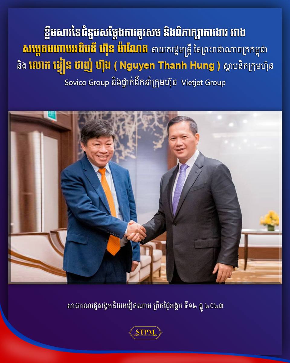 ក្នុងជំនួបនេះ លោក ង្វៀន ថាញ់ ហ៊ុង បានថ្លែងអំណរគុណចំពោះ សម្តេចធិបតី ដែលបានឆ្លៀតពេលវេលាដ៏មមាញឹកអនុញ្ញាតឱ្យរូបលោក និងសហការី ចូលជួបសម្តែងការគួរសម ព្រមទាំងបានជម្រាបជូន សម្តេចធិបតី អំពីក្រុមហ៊ុន Sovico Group ដែលមានសកម្មភាពអាជីវកម្ម និងក្រុមហ៊ុនបុត្រសម្ព័ន្ធជាច្រើន ហើយអាជីវកម្មមួយដែលលេចធ្លោ គឺក្រុមហ៊ុនអាកាសចរណ៍ Vietjet ដែលនឹងបើកដំណើរការជើងហោះហើរត្រង់ពីរដ្ឋធានីហាណូយ មកកាន់ខេត្តសៀមរាប ចាប់ពីថ្ងៃទី១៥ ខែធ្នូ ឆ្នាំ២០២៣ នេះតទៅ ។ លើសពីនេះ លោក ង្វៀន ថាញ់ ហ៊ុង ក៏បានសម្តែងនូវសុទិដ្ឋិនិយមផងដែរថា ក្រោមការដឹកនាំរបស់ សម្តេចមហាបវរធិបតី ហ៊ុន ម៉ាណែត នោះប្រទេសកម្ពុជា នឹងកាន់តែមានការរីកចម្រើងរុងរឿងប្រកបដោយវិបុលភាពជាក់ជាមិនខាន ។